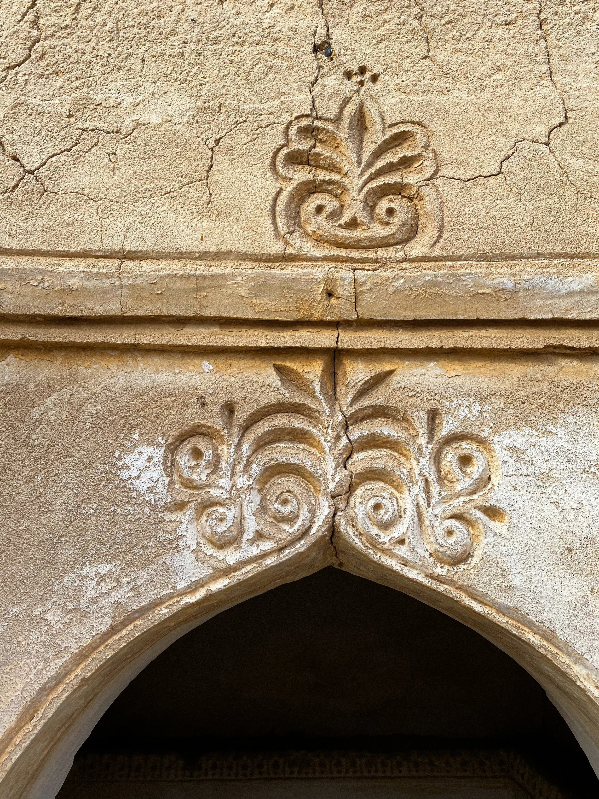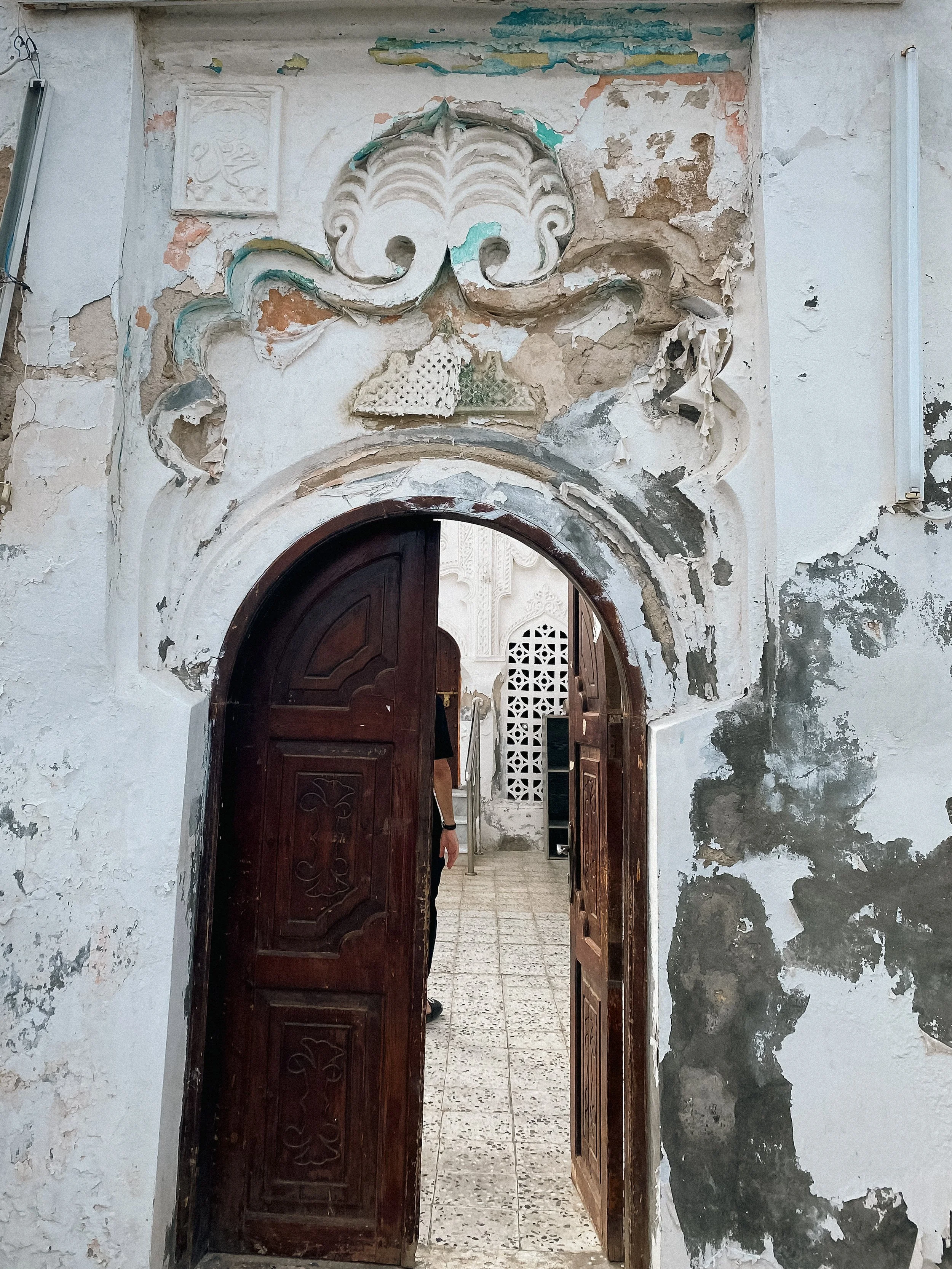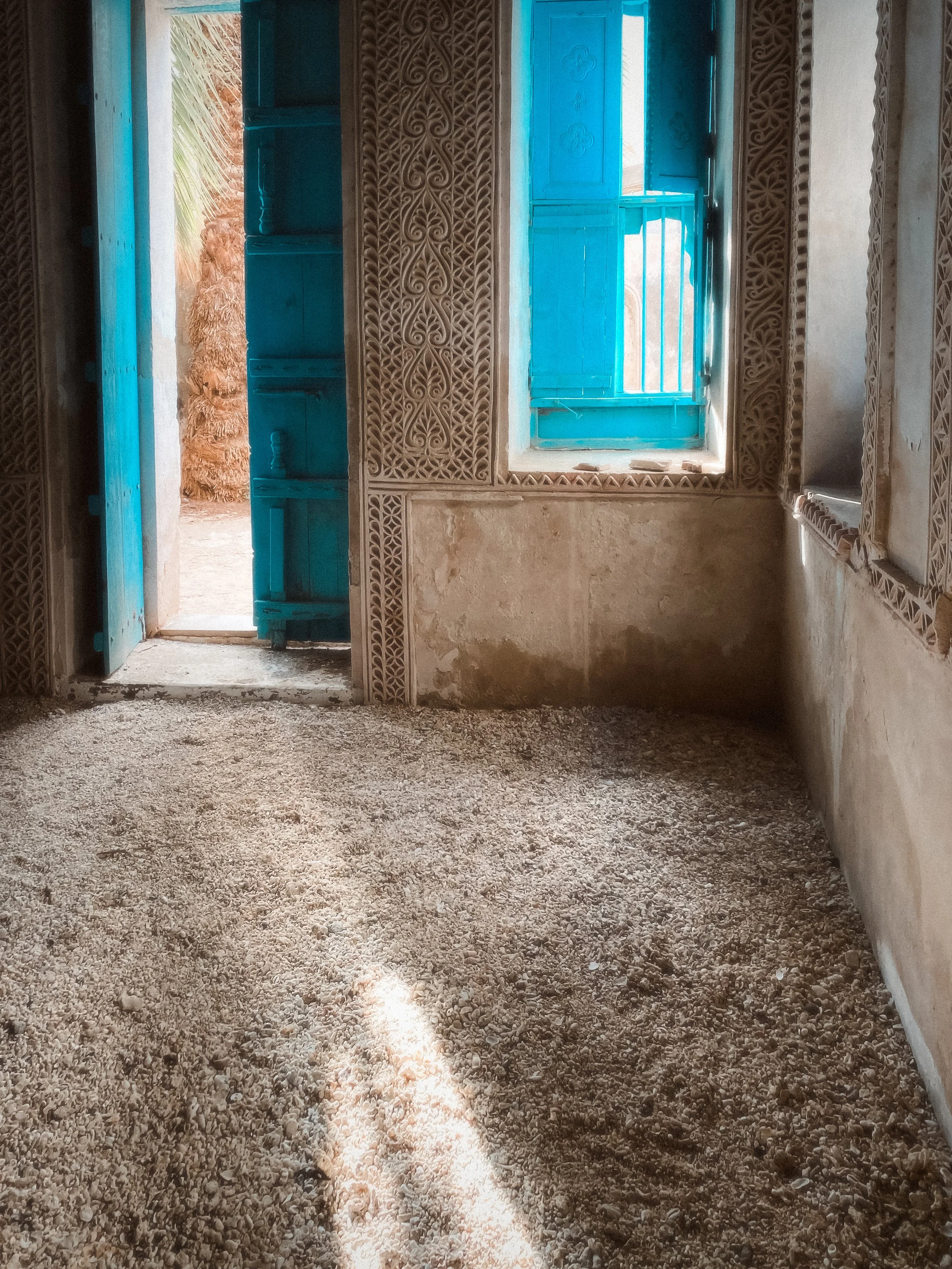 Gravel crunches underfoot as we are led through weathered cerulean doors and into the abandoned respite of the residence. Beneath us lies a cool bed of soft sand and finely crushed seashells, once walked upon barefoot by guests and dignitaries. The surrounding stone walls, recessed with engravings, temper a strong January sun, while tall shuttered windows allow light to seep inward, catching stray grains mid-flight.