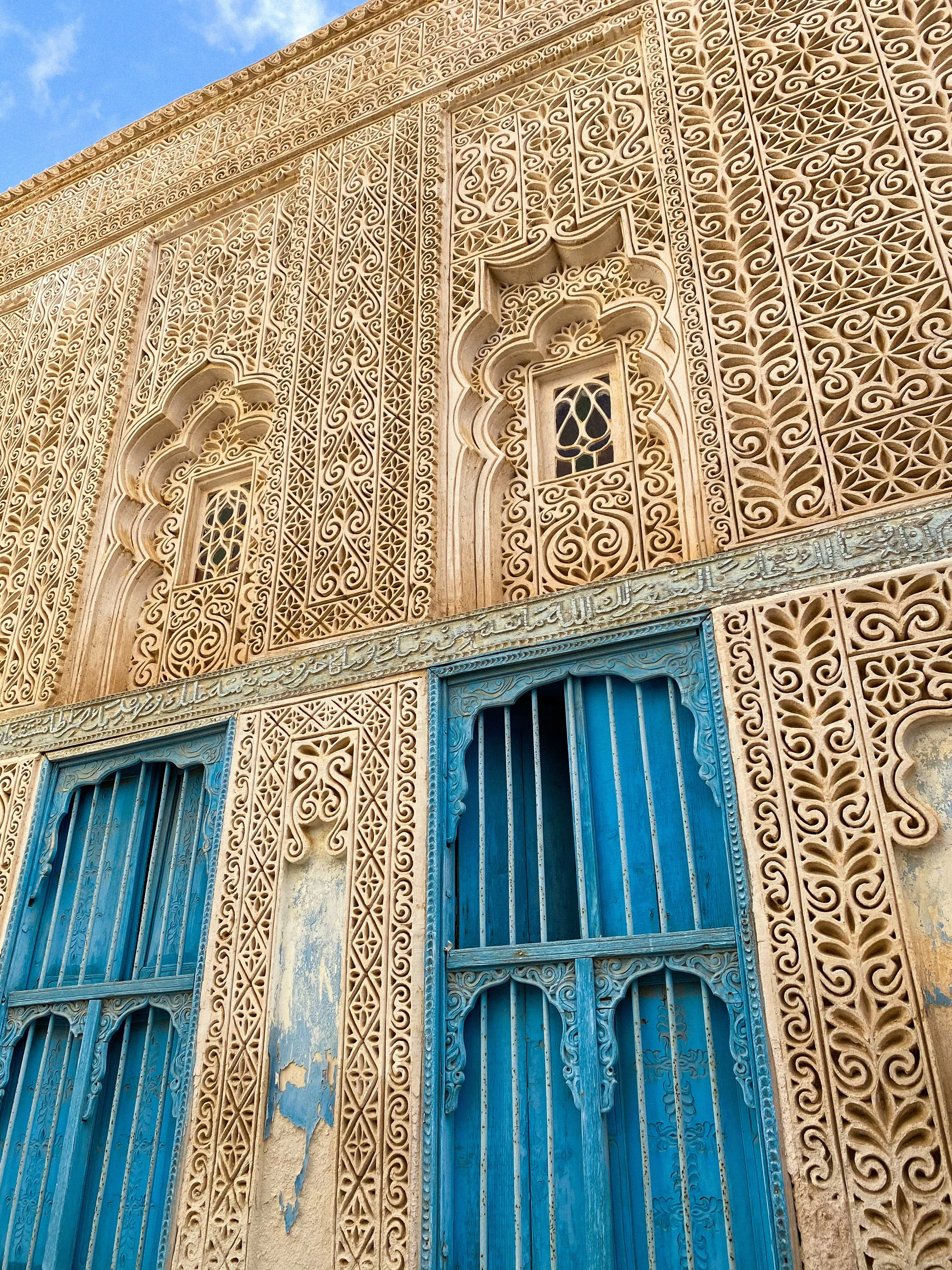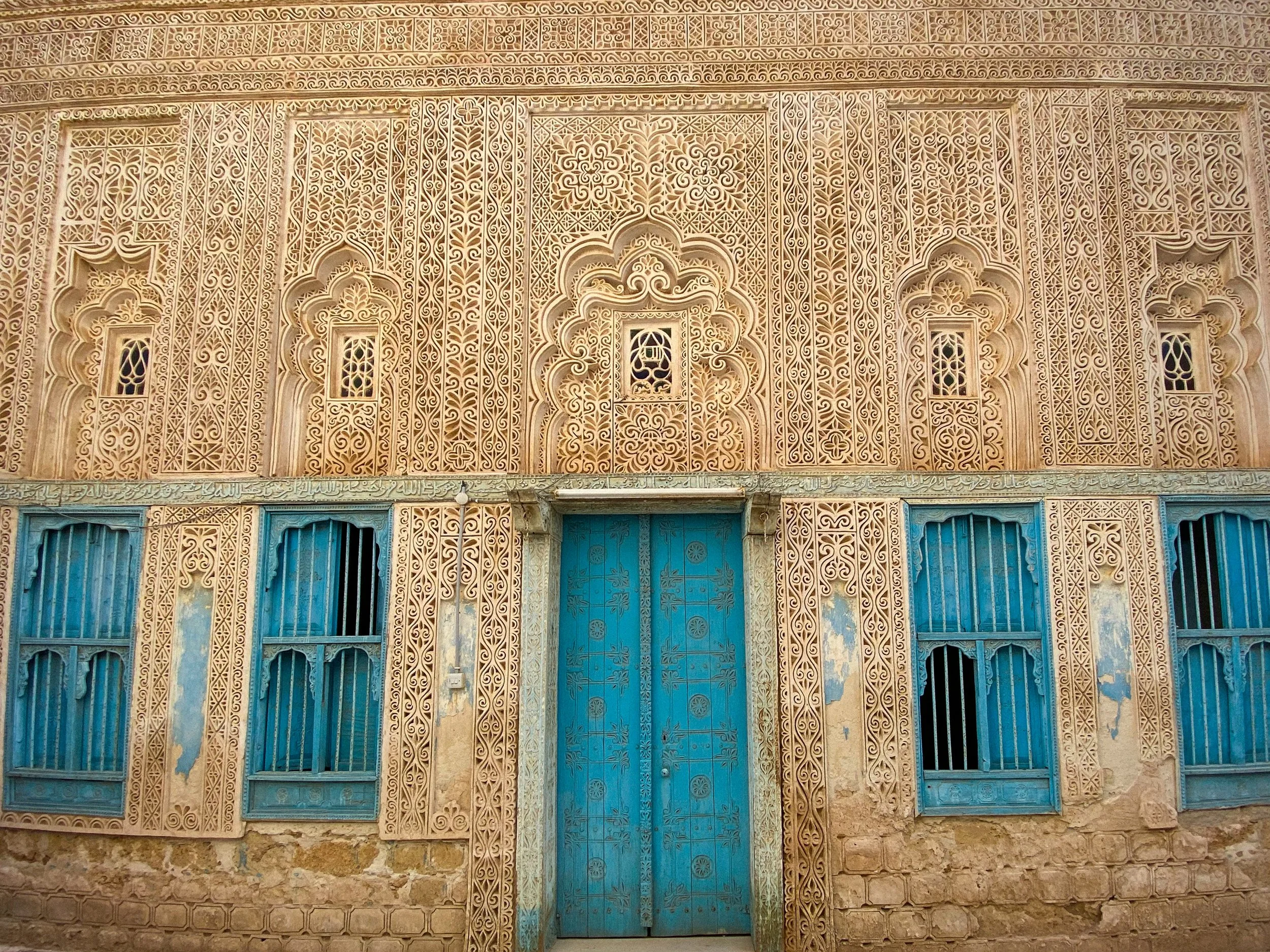 On approach, Beit Al Rifai demands admiration not simply through scale, but through the breathtaking craftsmanship that adorns every inch of its walls. Built as the residence of a wealthy pearl merchant and shaped by Indian architectural influence, its pale stone façades are etched with intricate carvings and Qur’anic inscriptions. Sun-bleached blue shutters punctuate the walls, paying quiet homage to the surrounding island. Here, the architectural grandeur is deepened rather than diminished by time.