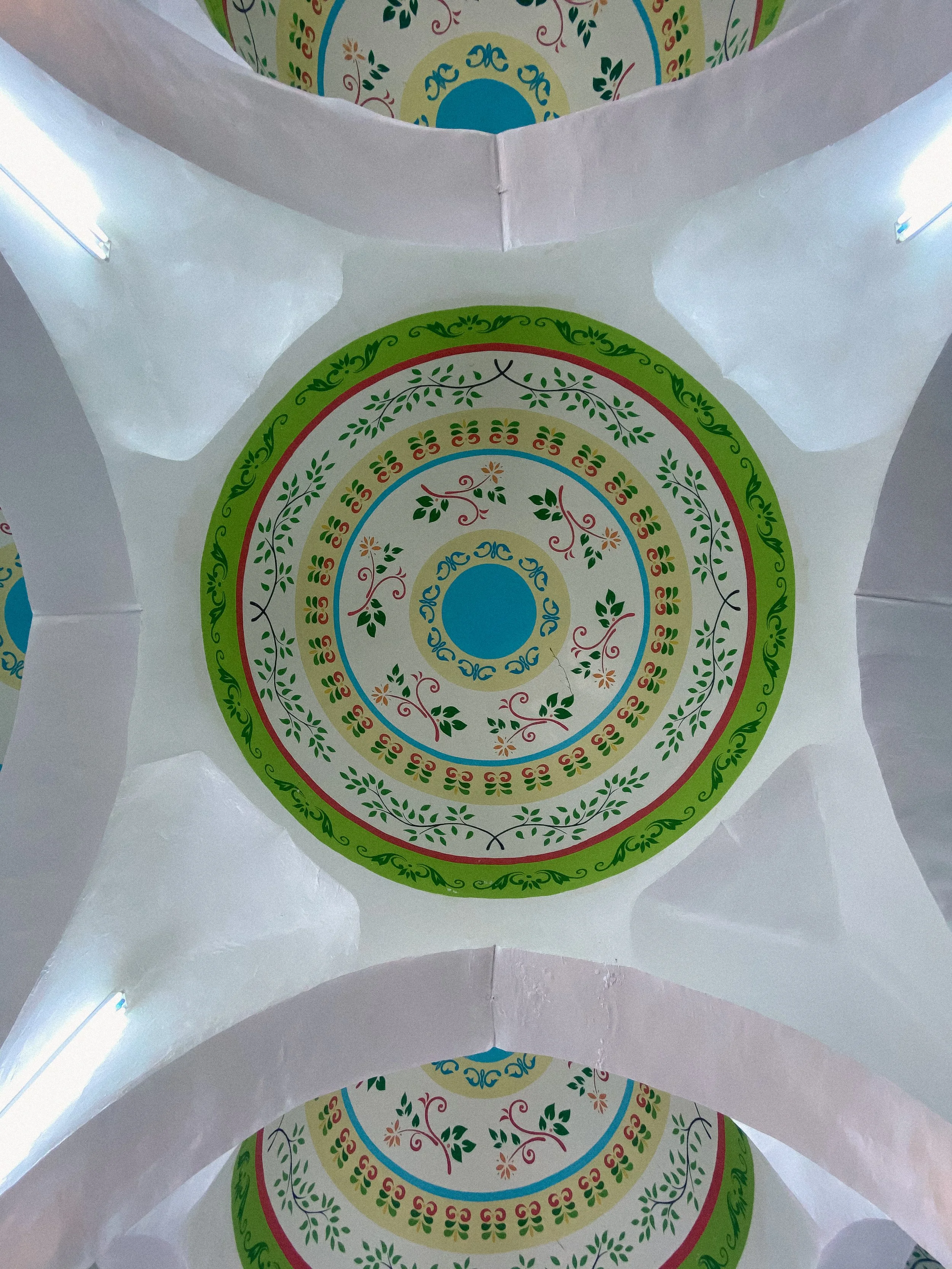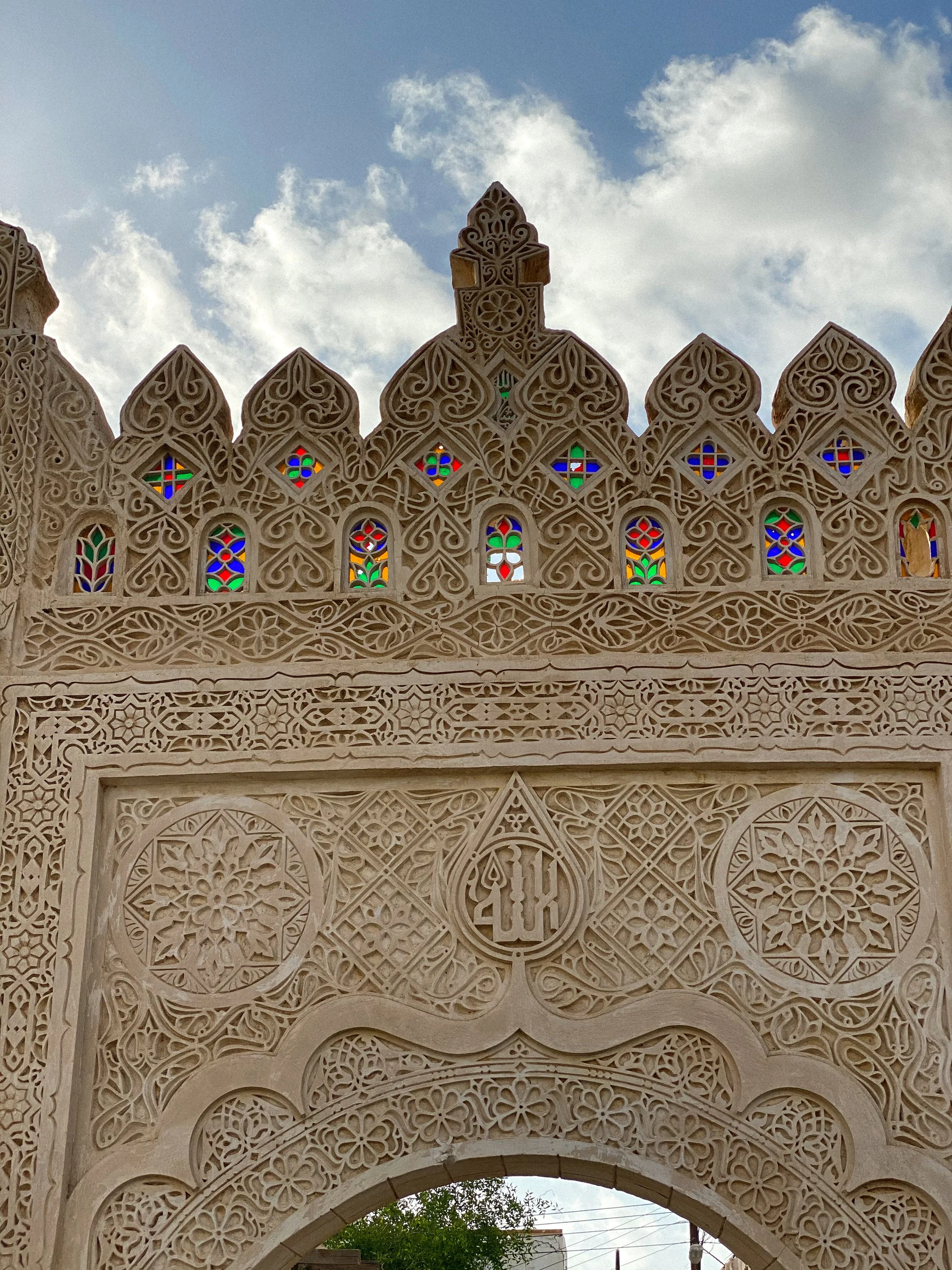 From its vast courtyard, wood-panelled doors welcome worshippers into the hush of the Najdi Mosque, where deep crimson carpet runs underfoot and ornate scalloped arches rise overhead. Fragments of sunlight glow through small squares of coloured stained glass set into the surrounding alcoves.